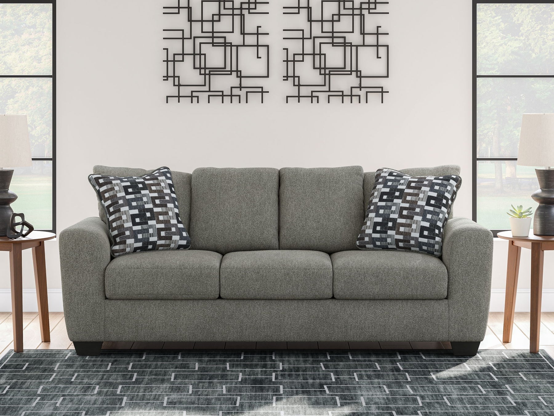 Transitional and right on trend. This seating set's upholstery is a delightful change from the ordinary, with hints of soft brown giving the gray hue added depth. It’s punctuated with chic accent pillows in an eye-catching, stylized stripe design. Whether you're hosting friends and family or relaxing solo, this set invites homey, comfortable character into your space.