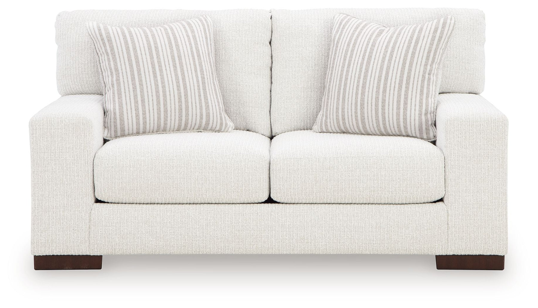 Easy on the eyes and irresistibly comfortable, this loveseat blends beautifully into any setting. Contemporary wide track arms and plush cushions covered in soft, stain-resistant Next-Gen Nuvella™ upholstery lend the set a sense of everyday ease. Simple striped accent pillows in complementary colors add subtle contrast.